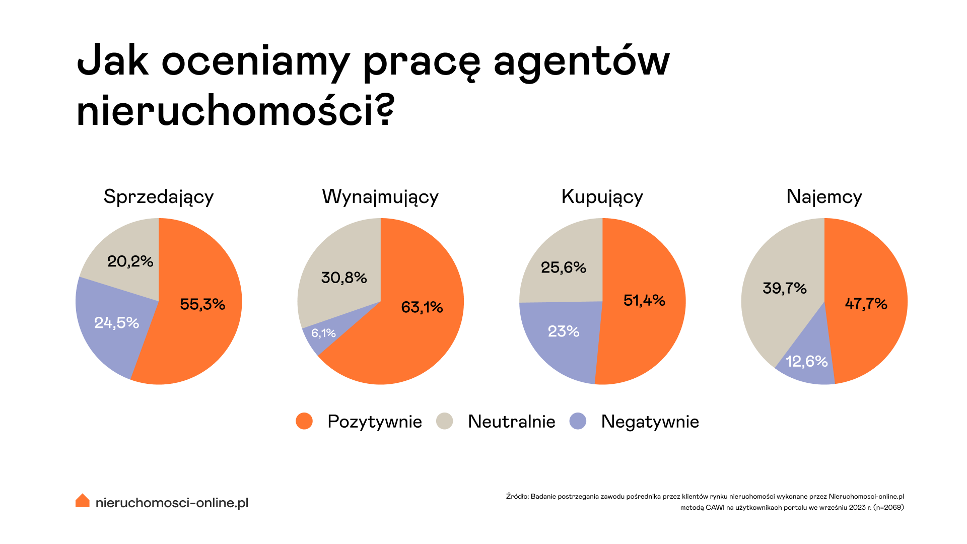 W przypadku osób sprzedających nieruchomości odsetek pozytywnych odpowiedzi również był wysoki (55 proc.), ale uwagę zwraca już dość liczna grupa niezadowolonych (24 proc.). Bardzo zbliżone wyniki pojawiły się w grupie osób, które współpracowały z pośrednikiem podczas poszukiwań nowej nieruchomości: ocenę pozytywną wystawiło 51 proc. kupujących, a negatywną 23 proc.