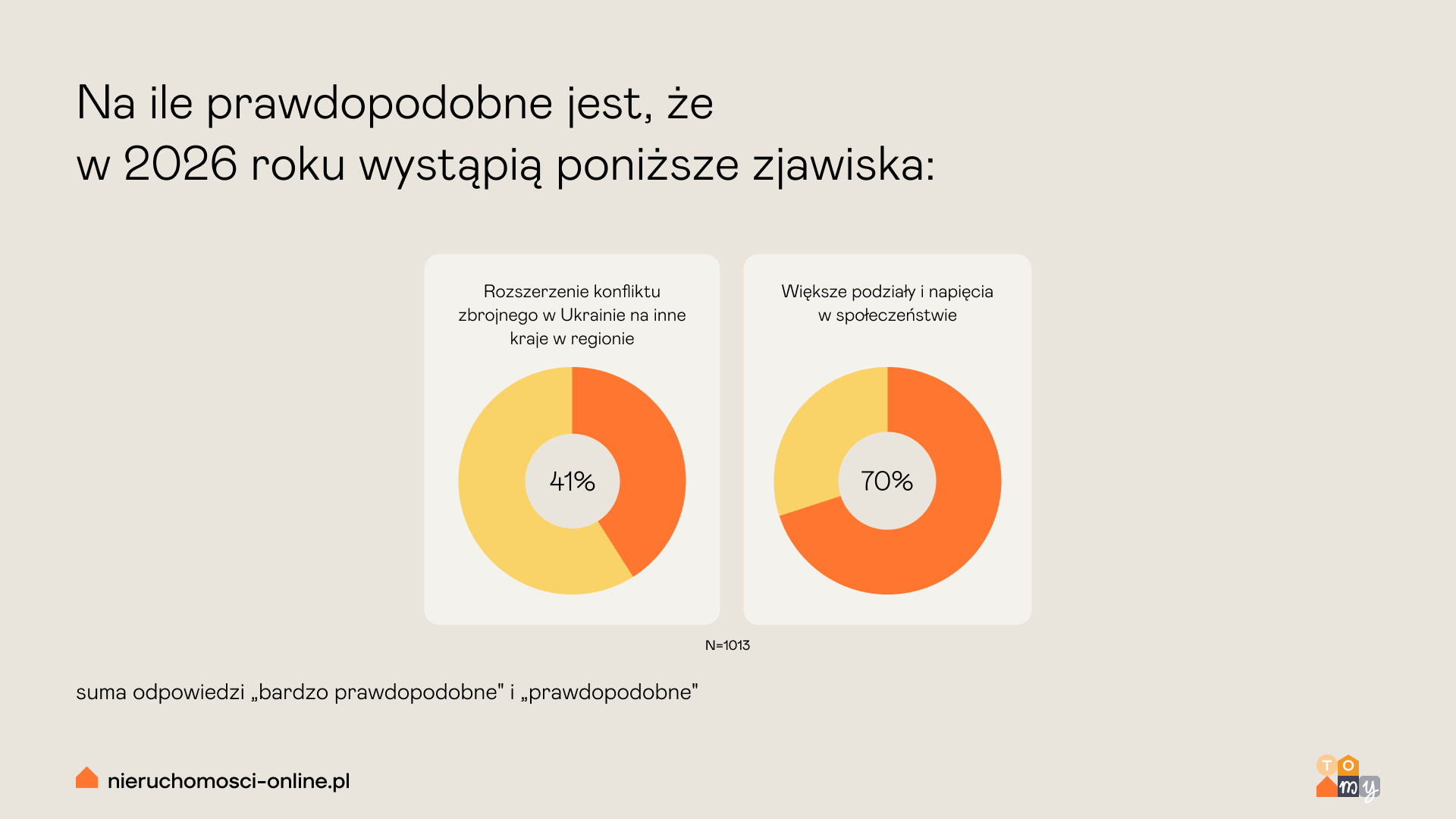 Raport „To my. Polacy o nieruchomościach – IV kwartał 2025” powstał na bazie badania, które portal ogłoszeniowy Nieruchomosci-online.pl przeprowadził na reprezentatywnej próbie 1013 dorosłych Polaków. Z badania wynika, że 41% uczestników uważa rozszerzenie konfliktu zbrojnego w Ukrainie na inne kraje regionu za „prawdopodobne” lub „bardzo prawdopodobne” w 2026 roku. Z kolei 28% ankietowanych odpowiedziało – „mało prawdopodobne”, 24% – „trudno powiedzieć”, a 7% uznało taki scenariusz za nierealny.
