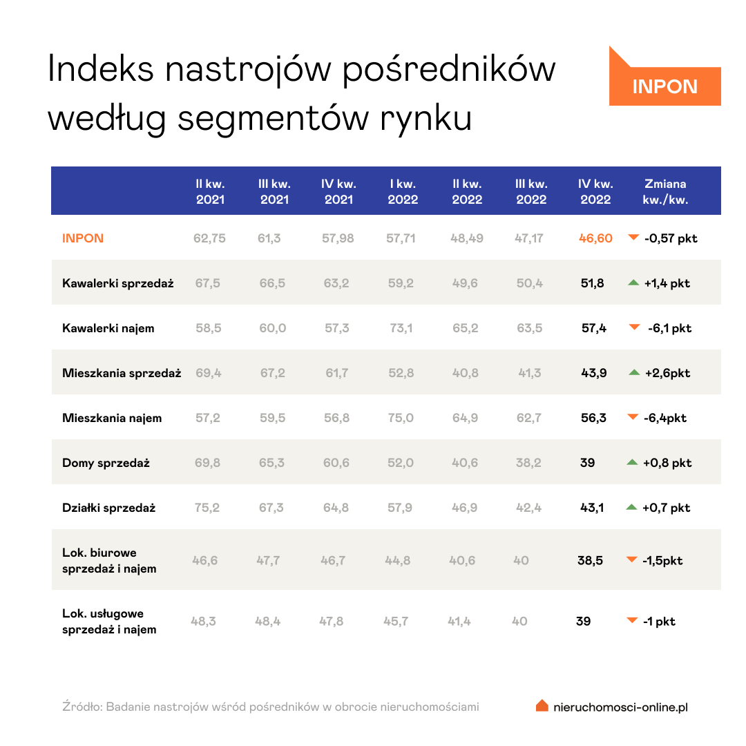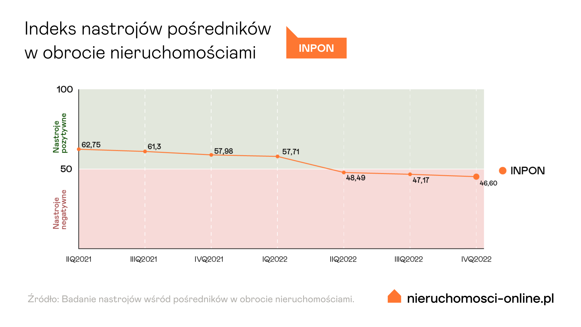 Indeks nastrojów pośredników, który jest barometrem atmosfery na rynku opartym na opiniach agentów z całej Polski, spadł w IV kwartale 2022 r. o 0,6 pkt: z 47,17 do 46,60 pkt. Wskaźnik publikowany przez Nieruchomosci-online.pl wciąż utrzymuje się poniżej granicy 50 pkt – oznacza to, że przy braku zmiany obecnych uwarunkowań nie ma perspektyw na poprawę sytuacji w najbliższym czasie. Rynek wciąż jest napędzany jedynie przez segment najmu oraz zakup mieszkań o mniejszym metrażu – na potrzeby własne lub pod inwestycję.