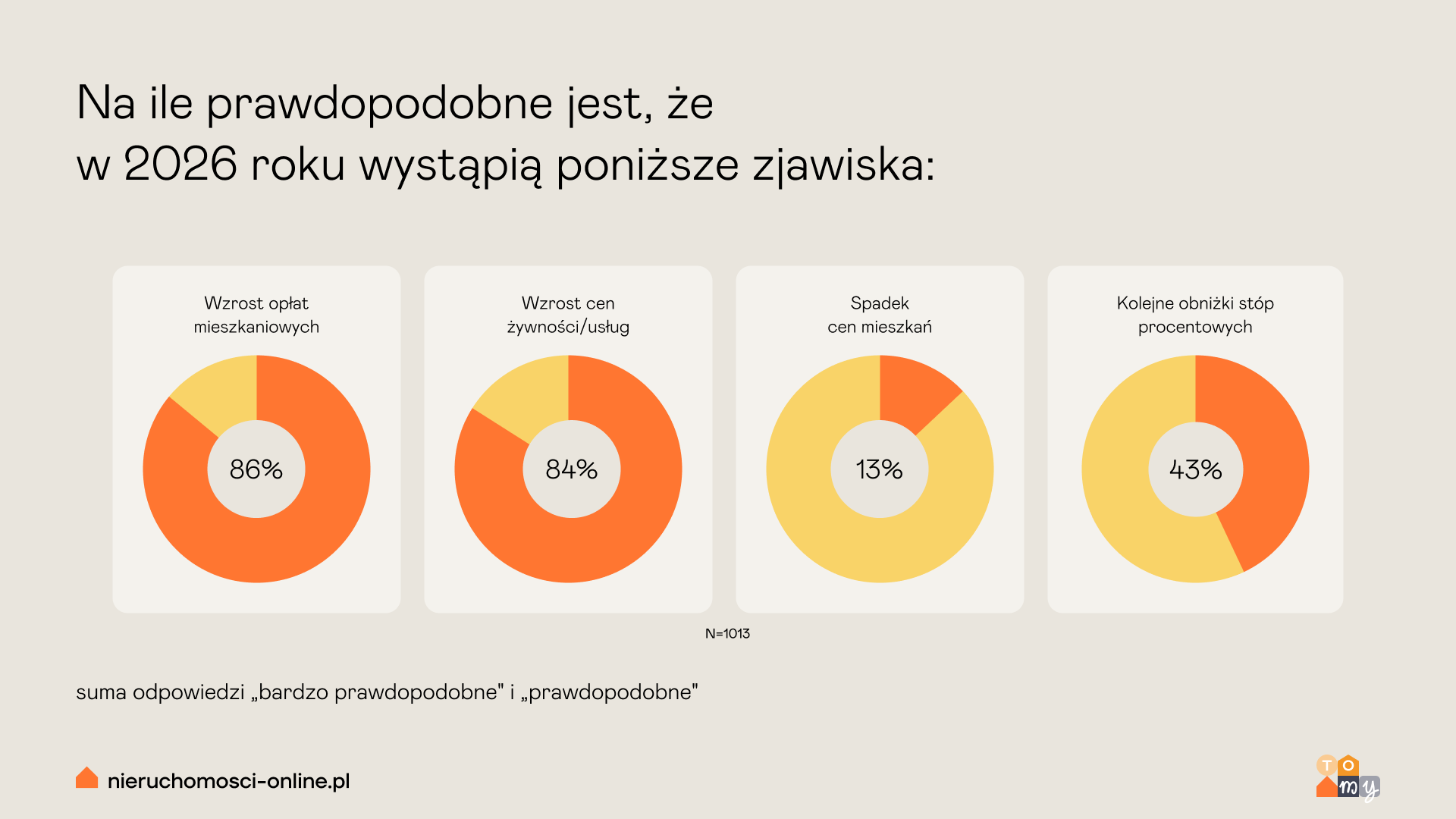 Jak wynika z najnowszej odsłony badania „To my. Polacy o nieruchomościach”, wiara w kolejne obniżki stóp procentowych jest jednak duża. Takich decyzji Rady Polityki Pieniężnej w 2026 roku spodziewa się 43% ankietowanych.