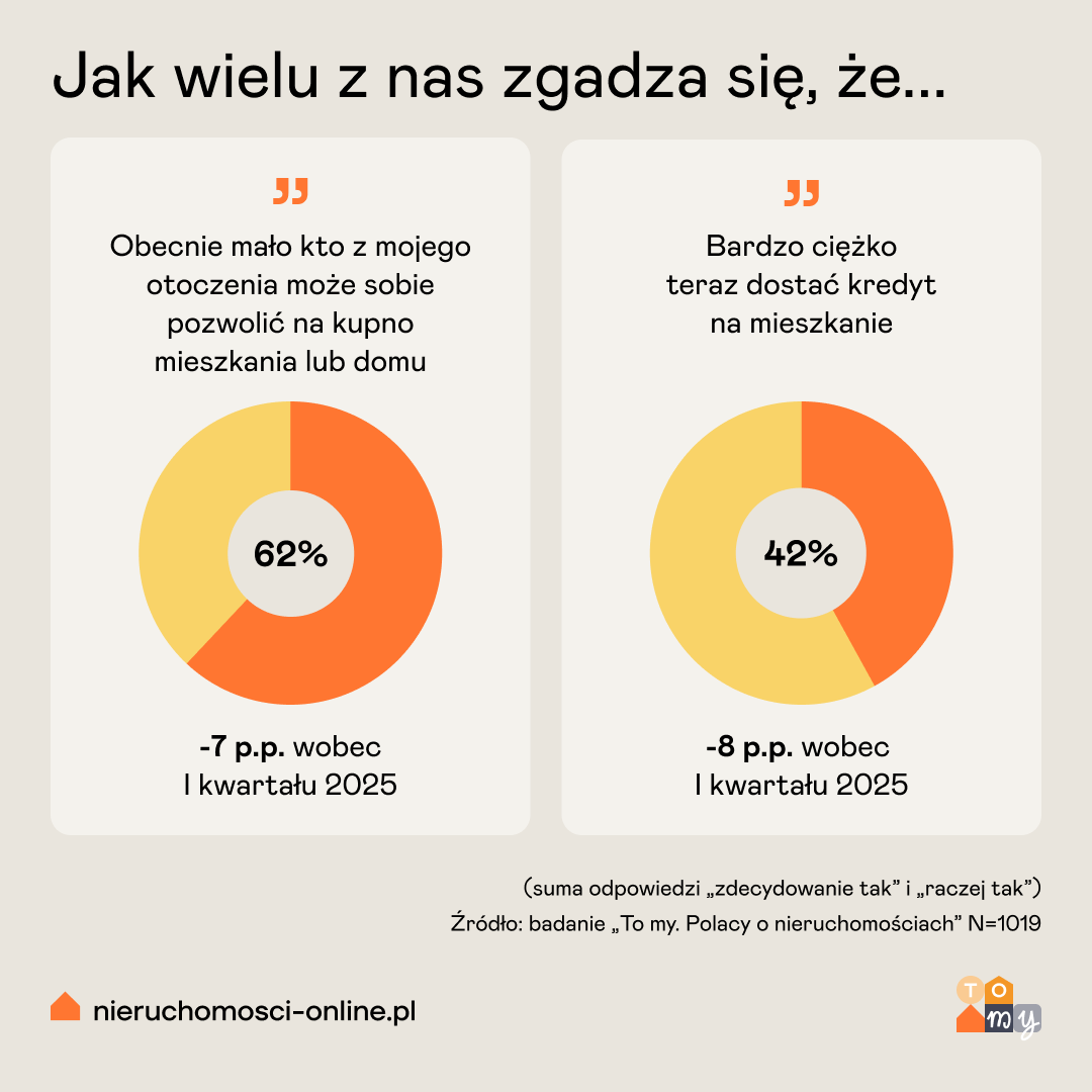 Jak wynika z najnowszej edycji badania „To my. Polacy o nieruchomościach – I kwartał 2026”, 62% osób jest zdania, że obecnie mało kogo z ich otoczenia stać na zakup mieszkania lub domu. To o 9 p.p. mniej niż w IV kwartale 2025 r., kiedy odsetek pesymistów wyniósł aż 71%.