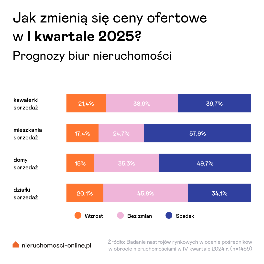 Jest też duże prawdopodobieństwo, że w dalszym ciągu będziemy świadkami widocznego już od III kwartału 2024 r. urealniania cen ofertowych kawalerek. W utrzymanie tego trendu w pierwszych miesiącach br. wierzy blisko 40 proc. przedstawicieli biur nieruchomości. To pozytywne wieści dla singli, którzy stanowią zdecydowanie najliczniejszą grupę kupujących mieszkania 1-pokojowe.