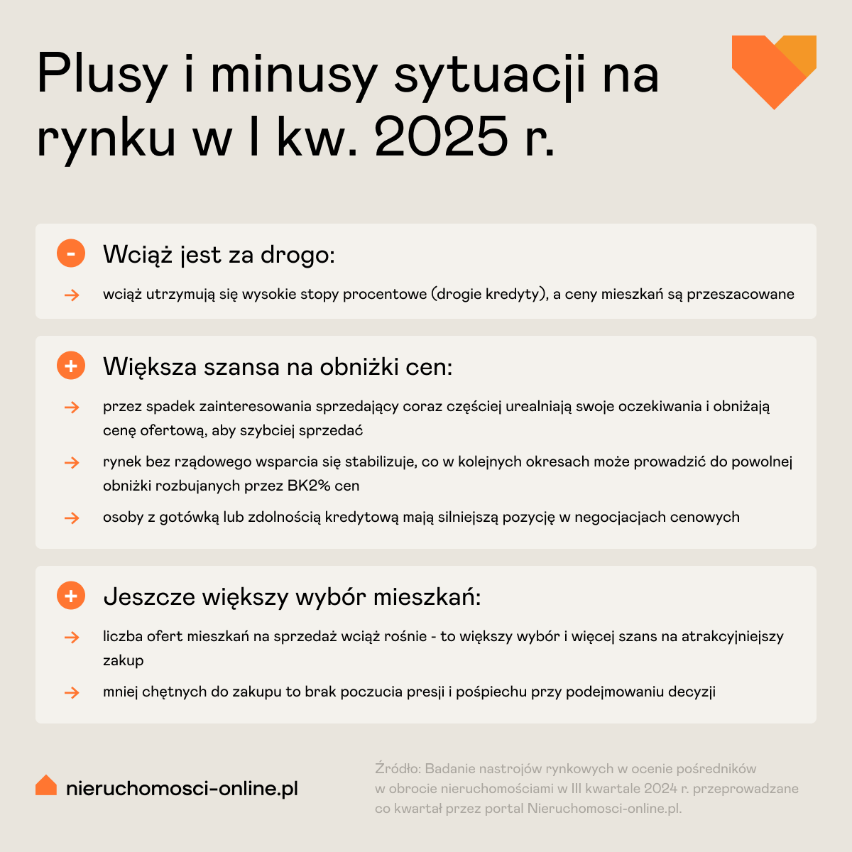 W najbliższych miesiącach popyt na nieruchomości pozostanie raczej na poziomie zbliżonym do tego obserwowanego w ostatnim kwartale 2024 r. – będzie więc mocno ograniczony. Uczestnicy badania nastrojów wskazali dwa główne impulsy, które mogłyby zachęcić Polaków do częstszych poszukiwań nieruchomości: nowy program wsparcia (według zapowiedzi rządu, w I kwartale br. gotowy ma być projekt ustawy) oraz obniżka stóp procentowych.