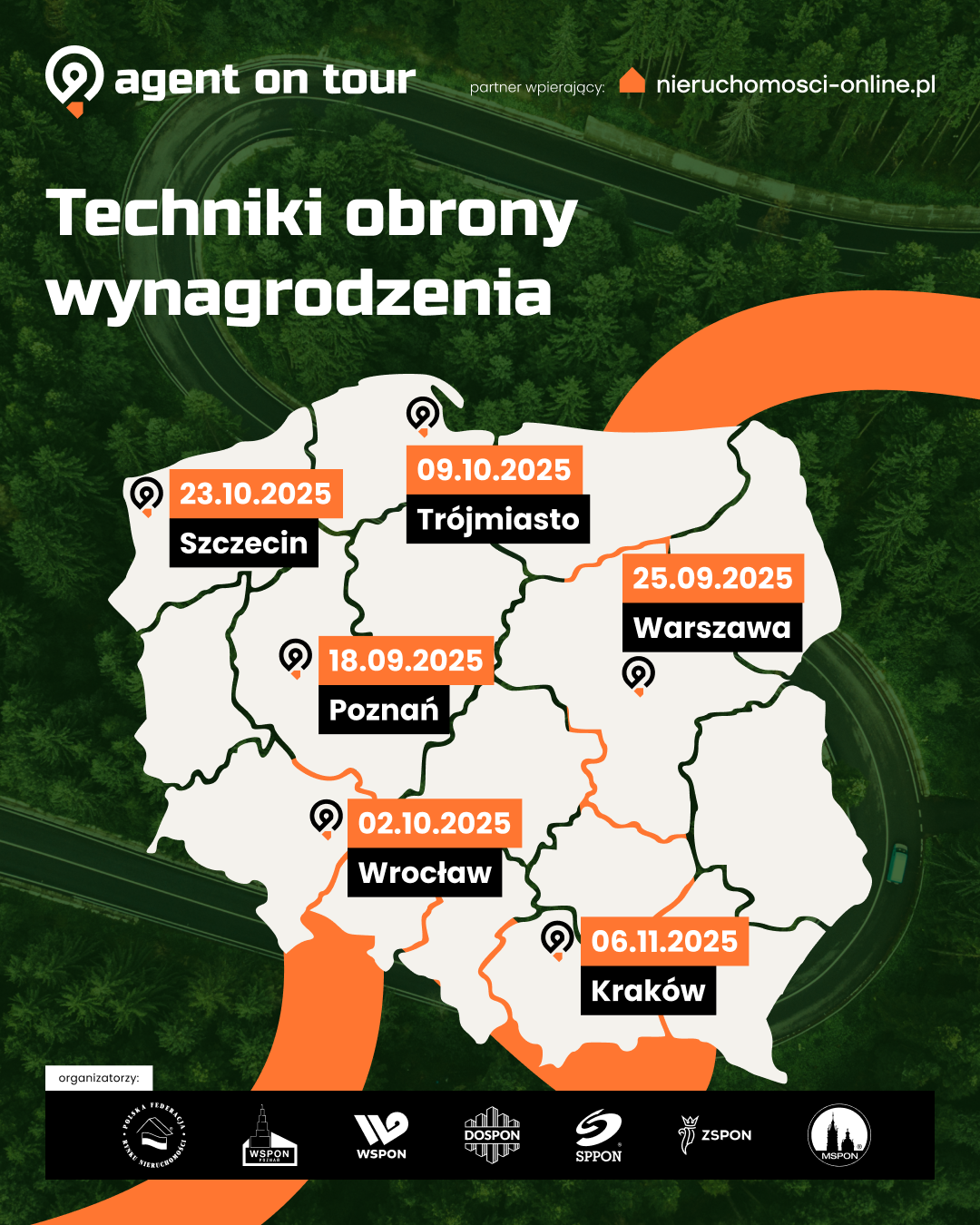 Jak budować wartość usługi w oczach klienta tak, by nie miał wątpliwości przy regulowaniu faktury? Odpowiedź uzyskasz podczas szkolenia „Techniki obrony wynagrodzenia” w ramach ogólnopolskiej trasy Agent on Tour. To wydarzenie zorganizowane wspólnie przez stowarzyszenia pośredników nieruchomości z całej Polski.