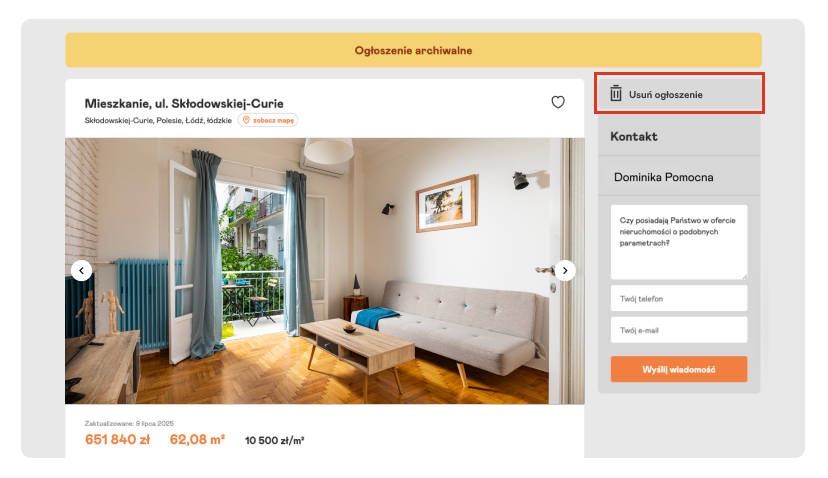 - samodzielnie usunąć ofertę z portalu – klikając „Usuń” z poziomu widoku ogłoszenia (aby zobaczyć tę opcję, trzeba być zalogowanym do swojego konta).