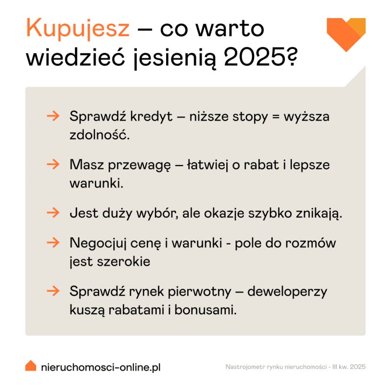 Rynek nieruchomości wchodzi w końcówkę 2025 roku spokojnie i przewidywalnie. Stabilny poziom wyniku Nastrojometru mówi o tym, że na rynku nie ma gwałtownych zmian, za to pojawiła się równowaga i większy realizm. Sprawdzamy, czy to dobry czas na decyzję i na co warto zwrócić uwagę przy zakupie mieszkania jesienią 2025.