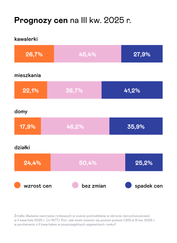W opinii pośredników nie będzie dalszego wzrostu cen. Najwięcej głosów wskazuje na spadki mieszkań większych (41,2 proc. pośredników) i domów (35,9 proc.). Działki trzymają wartość, zwłaszcza w kontekście nadchodzących zmian planistycznych od 2026 r.
