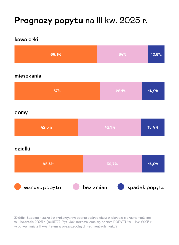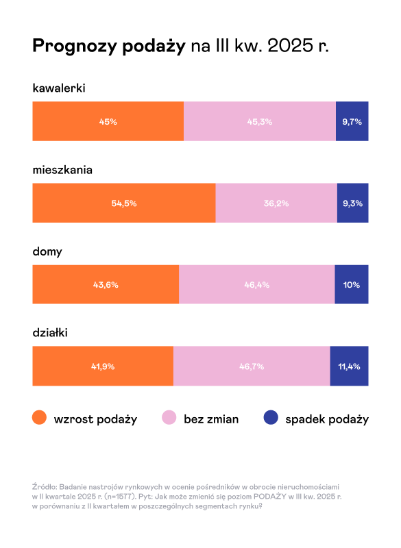 W III kwartale 2025 r. więcej nieruchomości trafi na rynek – tak uważa prawie połowa badanych pośredników (54,5 proc. pośredników w przypadku mieszkań, 45 proc. w przypadku kawalerek oraz 43,6 proc. dla domów i 41,9 proc. dla działek). To oznacza coraz większą konkurencję wśród sprzedających – szczególnie w segmencie mieszkań, gdzie przewaga ofert będzie najbardziej odczuwalna.