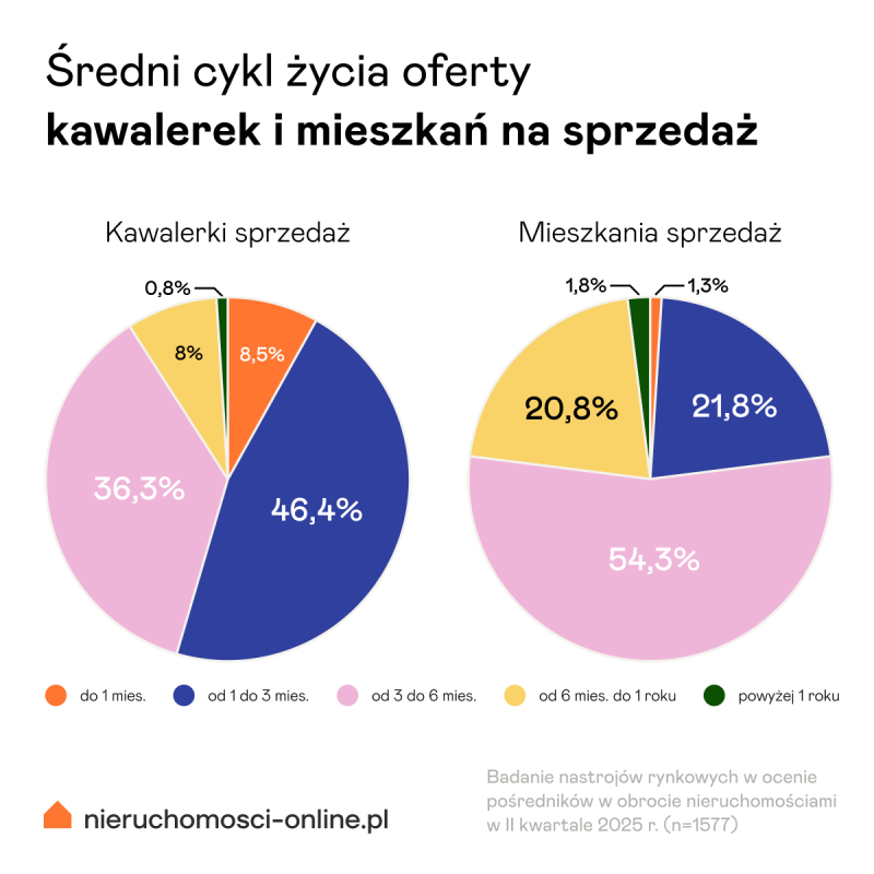 Najlepiej radzą sobie kawalerki. Choć i tu prawie połowa pośredników widzi wydłużenie czasu sprzedaży, to jednocześnie właśnie one najczęściej sprzedają się szybciej niż wcześniej. Potwierdza to, że małe i tańsze mieszkania wciąż są w cenie – szczególnie dla osób kupujących „na swoje” albo inwestycyjnie. Kawalerki sprzedają się najszybciej – aż 54,9% pośredników wskazuje, że transakcje finalizują się w ciągu do 3 miesięcy (8,5% w ciągu miesiąca i 46,4% w ciągu 1–3 miesięcy). Kolejne 36,3% mówi o sprzedaży między 3 a 6 miesiącem, a jedynie 8,8% przypadków trwa dłużej niż pół roku.