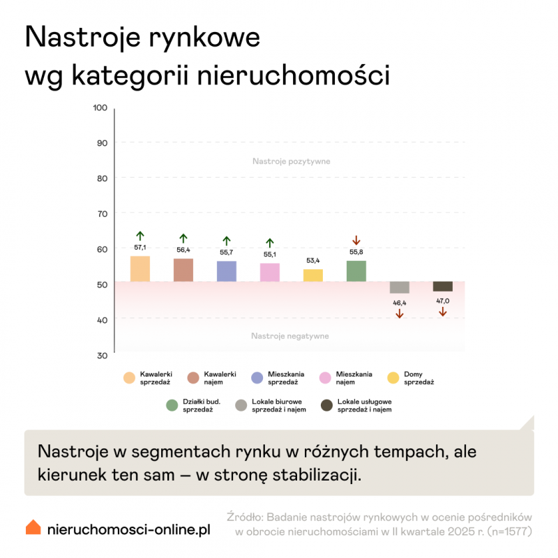 W I kwartale 2025 r. poprawa nastrojów odczuwalna była w każdym typie nieruchomości, chociaż o różnym nasileniu. Można jednak śmiało powiedzieć, że nastroje wróciły do poziomu bardzo ostrożnego optymizmu. Wpłynęły na to m.in. rządowe zapowiedzi programu dopłat do kredytów oraz większa elastyczność cenowa wieszcząca koniec szaleństwa cenowego. Wprawdzie podstawą rynku wciąż są wysokie ceny, które zostały wygenerowane przez poprzednie wsparcie rządowe, ale osoby sprzedające — w głównie w miastach — nie trzymają się już tak kurczowo swoich cen wyjściowych, co zapowiadać może wzrost liczby transakcji.