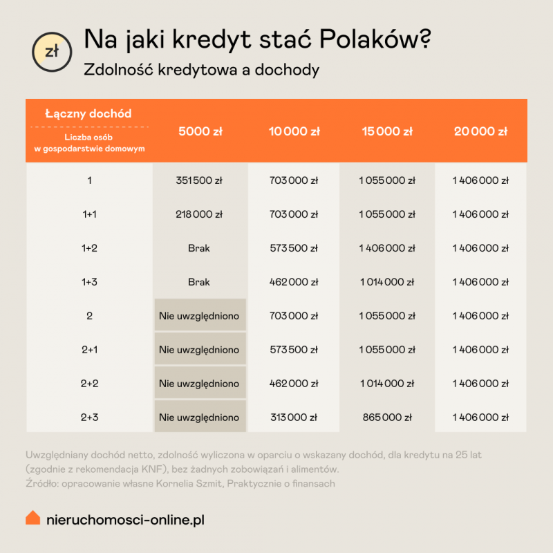 – Dostęp do kredytu hipotecznego w Polsce charakteryzuje się wyraźną stratyfikacją społeczną. Dla gospodarstwa jednoosobowego o dochodzie 5000 zł netto, zdolność kredytowa na poziomie 351 500 zł de facto eliminuje możliwość zakupu nieruchomości w aglomeracjach miejskich, gdzie średnie ceny mieszkań przekraczają 10-12 tysięcy złotych za metr kwadratowy. Sytuacja gospodarstw wieloosobowych prezentuje się odmiennie. Para bez dzieci dysponująca łącznym dochodem 15 000 zł osiąga zdolność kredytową ponad miliona złotych, co już umożliwia realne rozważanie zakupu mieszkania. Interesujące jest jednak, że progresja zdolności kredytowej nie jest liniowa względem wielkości gospodarstwa - rodzina 2+2 przy identycznym dochodzie ma niższą zdolność niż bezdzietna para, co odzwierciedla uwzględnienie przez banki wyższych kosztów utrzymania – analizuje Kornelia Szmit, ekspertka kredytowa.