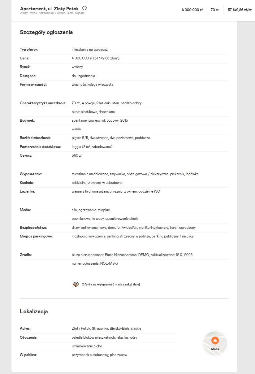 Rolę podsumowania najważniejszych informacji odgrywa tabela w ogłoszeniu. Automatycznie zapełniana jest danymi z pól, a co ważne – grupuje je w tematyczne sekcje, łatwe do przyswojenia. Znajduje się tuż pod galerią, ale jeszcze nad opisem. Często informacje w niej zawarte już wystarczają poszukującemu, by podjąć kontakt z ogłoszeniodawcą. A to jest przecież nasz najważniejszy wspólny cel do zrealizowania.