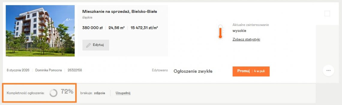 Warto wypełnić pola formularza najpełniej jak się da, ale oczywiście wedle posiadanych o nieruchomości informacji. Nie zawsze wiemy wszystko, nie zawsze też wszystkie pola mają zastosowanie akurat do tej konkretnej nieruchomości. Stąd 100-procentowe wypełnienie pól formularza zdarza się tylko nielicznym. I nie szkodzi, bo wartość procentowa przy ogłoszeniu pełni wyłącznie funkcje informacyjną!