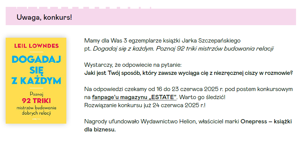 Wiedza i inspiracje do wykorzystania od ręki dostarczane przez doświadczonych uczestników rynku nieruchomości z zakresu marketingu nieruchomości, sprzedaży i negocjacji, prawa i finansów oraz rozwoju osobistego.