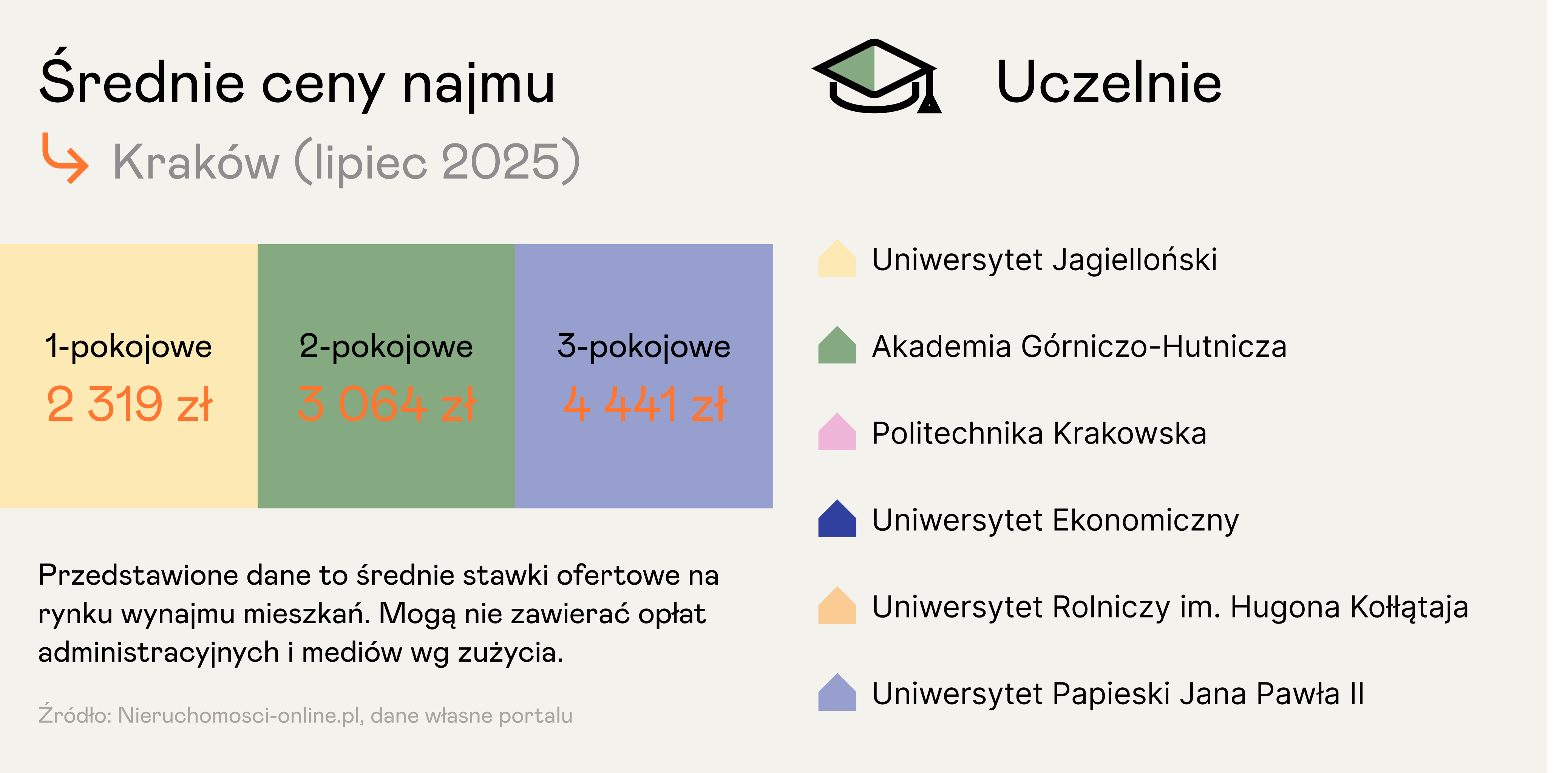 Przeszukaliśmy średnie ceny ofertowych mieszkań na wynajem w Krakowie, aby pomóc studentom w odnalezieniu odpowiednich lokalizacji, w których będą mogli korzystać z różnorodnych możliwości, jakie oferuje Kraków. W przypadku kawalerek wynajem 1-pokojowego lokum w Krakowie (w lipcu 2025) oscyluje wokół kwoty 2 319 zł. Jeśli poszukujesz dwupokojowego mieszkania, przygotuj się na wydatek około 3 064 zł. Planując wynajem trzypokojowego mieszkania, trzeba spodziewać się wydatku rzędu 4 441 zł.