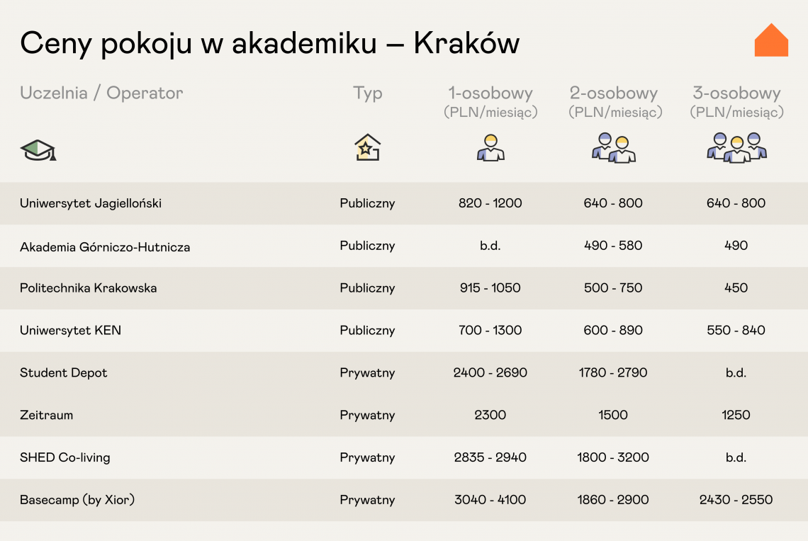 Przeanalizowaliśmy, ile trzeba dziś zapłacić za miejsce w akademiku w Krakowie – i to zarówno w uczelnianym, jak i prywatnym. Sprawdziliśmy ceny pokoi 1-, 2- i 3-osobowych na rok 2025/2026. Okazuje się, że domy studenta przy uczelniach wciąż są najtańszą opcją, choć oferują mniej dodatków. Coraz częściej jednak przechodzą remonty i wyglądają naprawdę przyzwoicie. Prywatne akademiki to wyższy standard – i wyższe ceny – ale w zamian dostajemy np. siłownię, pokój gier czy wspólne miejsca do nauki. A jeśli ktoś chce mieć jeszcze więcej luzu i przestrzeni, może rozważyć wynajem mieszkania – szczególnie w kilka osób. Może wyjść korzystnie, a komfort będzie duży.