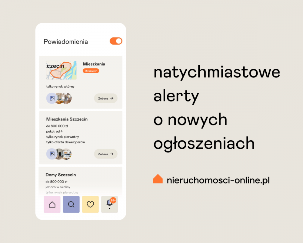 To miejsce, gdzie mamy szybki dostęp do nowych ogłoszeń zgodnych z naszymi zapisanymi kryteriami. Włączenie powiadomień na dowolnej liście powoduje zapisanie kryteriów wyszukiwania, a aplikacja wyśle alert, gdy tylko pojawi się dopasowana nieruchomość.