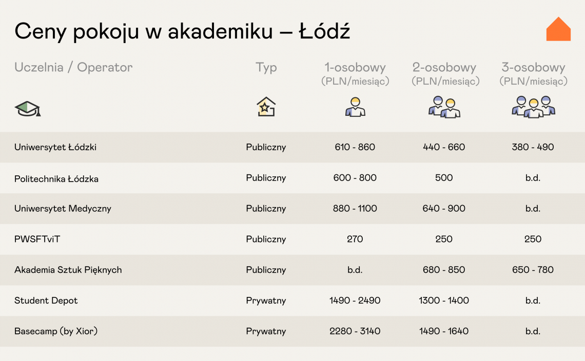 Szukasz pokoju w akademiku w Łodzi na rok 2025/2026? Sprawdziliśmy, jakie są ceny wynajmu miejsc w pokojach 1-, 2- i 3-osobowych. Publiczne akademiki wciąż wygrywają ceną – to najlepsza opcja dla tych, którzy chcą zaoszczędzić. Ale prywatne akademiki mają coraz więcej do zaoferowania: wysoki standard, siłownie, pokoje wspólne i przestrzenie do nauki. To świetna opcja, jeśli cenisz komfort. A jeśli marzy ci się jeszcze więcej swobody, pomyśl o mieszkaniu ze znajomymi – przy podziale kosztów może to być naprawdę rozsądne rozwiązanie.