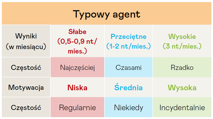 Agent celuje w 50 nowych transakcji rocznie (około 4 NT/mies.) i osiąga ten cel, akceptuje nieszczelności, wiedząc, że co najmniej kilkanaście transakcji mu „uciekło”, ponieważ: