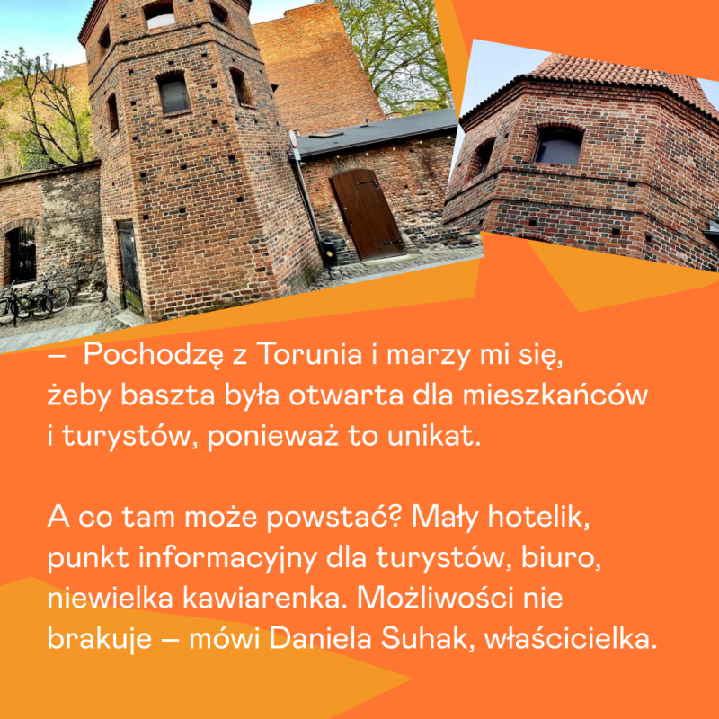 –... To będzie taka ambiwalencja zachowań, ponieważ z jednej strony będzie radość, a z drugiej dusza będzie cierpieć, że to nie moje dzieło. Cóż, taka jest ludzka natura. Mam nadzieję, że znajdzie się inwestor z pomysłem na to miejsce. Pochodzę z Torunia i marzy mi się, żeby baszta była otwarta dla mieszkańców i turystów, ponieważ to unikat. A co tam może powstać? Mały hotelik, punkt informacyjny dla turystów, biuro, niewielka kawiarenka. Możliwości nie brakuje – stwierdza właścicielka.