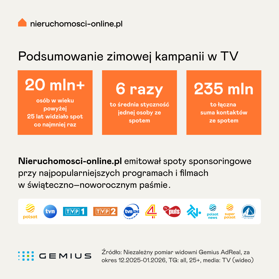 Zaraz po kampanii grudniowo-styczniowej, już w lutym portal Nieruchomosci-online.pl rozpoczął jedną ze swoich najintensywniejszych kampanii brandowych w 2026 roku. Najsilniej celujemy w Wielkanoc i majówkę, kiedy kiełkujące marzenia i plany przekładają się na decyzje mieszkaniowe. Jako marka konsekwentnie stawiamy na autentyczność i emocje, jednocześnie budując zaufanie milionów Polaków poprzez obecność w telewizji już piąty rok z rzędu.
