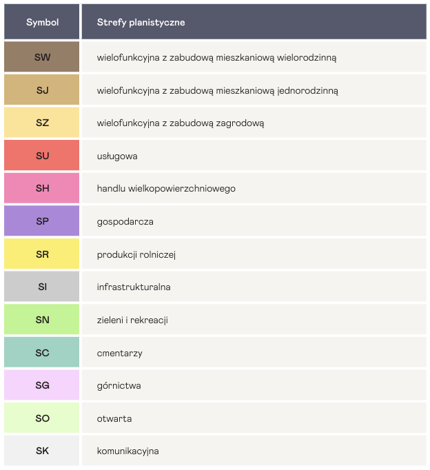Strefy planistyczne będą oznaczone w planie ogólnym gminy swoim indywidualnym kolorem, który został im przypisany, w rozporządzeniu Ministra Rozwoju i Technologii z dnia 8 grudnia 2023 r. w sprawie projektu planu ogólnego gminy, dokumentowania prac planistycznych w zakresie tego planu oraz wydawania z niego wypisów i wyrysów (Dz. U.2023.2758 ze zm.)