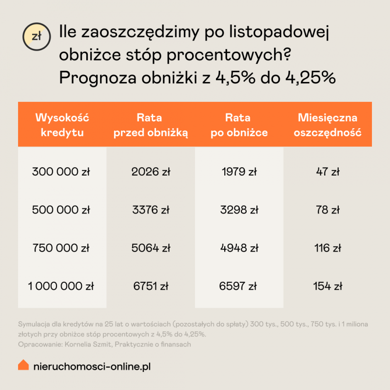To zależy od perspektywy. Sama listopadowa obniżka o 0,25 punktu procentowego to relatywnie niewielki ruch. Dla porównania: jeśli stopy spadną jeszcze do 3,75% (jak zakładają prognozy na połowę 2026 roku), łączna oszczędność przy kredycie 500 tysięcy złotych wyniesie około 230 złotych miesięcznie w stosunku do obecnej stopy 4,50%. Rocznie to 2 760 złotych, przez 25 lat – 69 000 złotych.