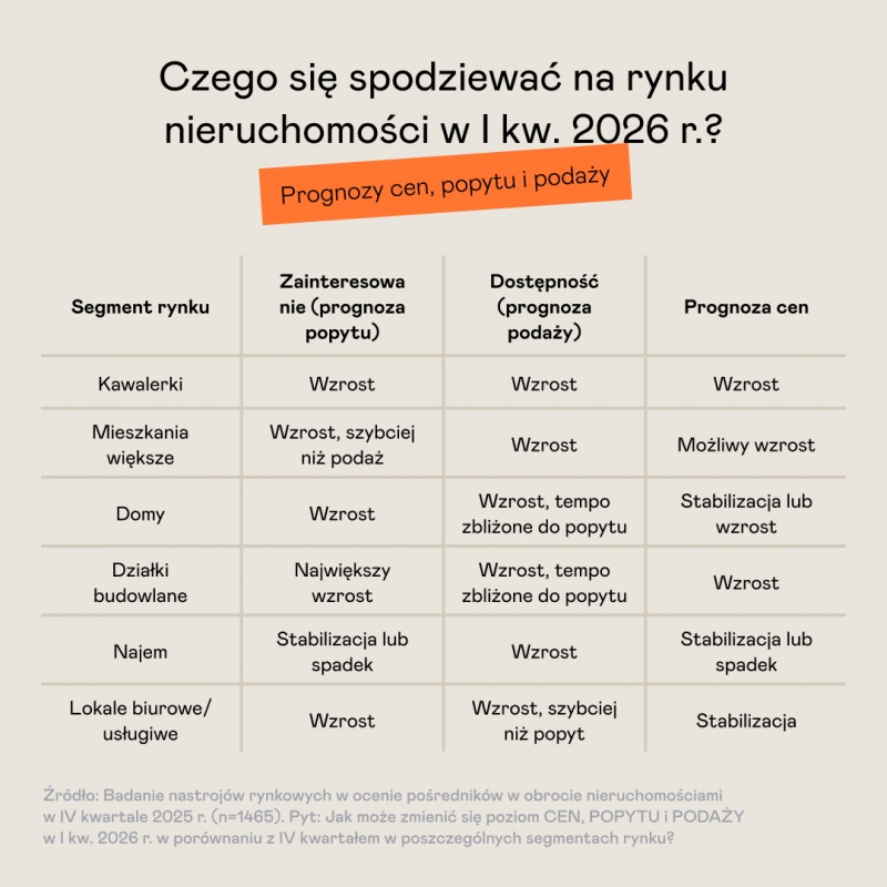 Z badania po IV kwartale, w którym wzięło udział prawie 1500 pośredników w obrocie nieruchomościami z całej Polski wynika, że największe nadzieje wiązane są z segmentami sprzedaży mieszkań większych, domów i działek budowlanych, gdzie prognozowany jest dalszy wzrost popytu i cen. Segment najmu doświadcza wzrostu podaży i stabilizacji lub lekkiego spadku czynszów. Czynniki makroekonomiczne, takie jak obniżki stóp procentowych i wzrost gospodarczy, wspierają rynek, choć niepewność geopolityczna i wysokie ceny pozostają istotnymi wyzwaniami.