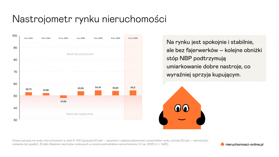 Nastrojometr rynku nieruchomości, opracowywany co kwartał przez portal Nieruchomosci-online.pl wraz z Uniwersytetem Ekonomicznym we Wrocławiu, wskazał 54,20 pkt – to czwarty kwartał z rzędu, kiedy indeks plasuje się powyżej granicy optymizmu (50 pkt), ale jednocześnie wzrost względem III kwartału jest symboliczny (mniej niż +0,4 pkt) – czyli nie ma tu nagłego przełomu, a raczej to sygnał, że rynek wyraźnie wychodzi z okresu niepewności i korekt, choć nadal nie wrócił do szczytów z początku 2024 roku (55,6 pkt).