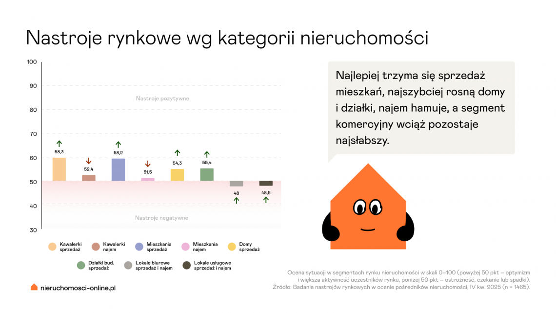 IV kwartał 2025 r. nie przynosi rewolucji, tylko utrwala nową normalność: umiarkowanie pozytywne nastroje (Nastrojometr = 54,20 pkt), przewaga chłodnych ocen, rynek klienta i segmentacja, w której sprzedaż mieszkaniówki i działek/domów wypada lepiej niż najem i komercja.
