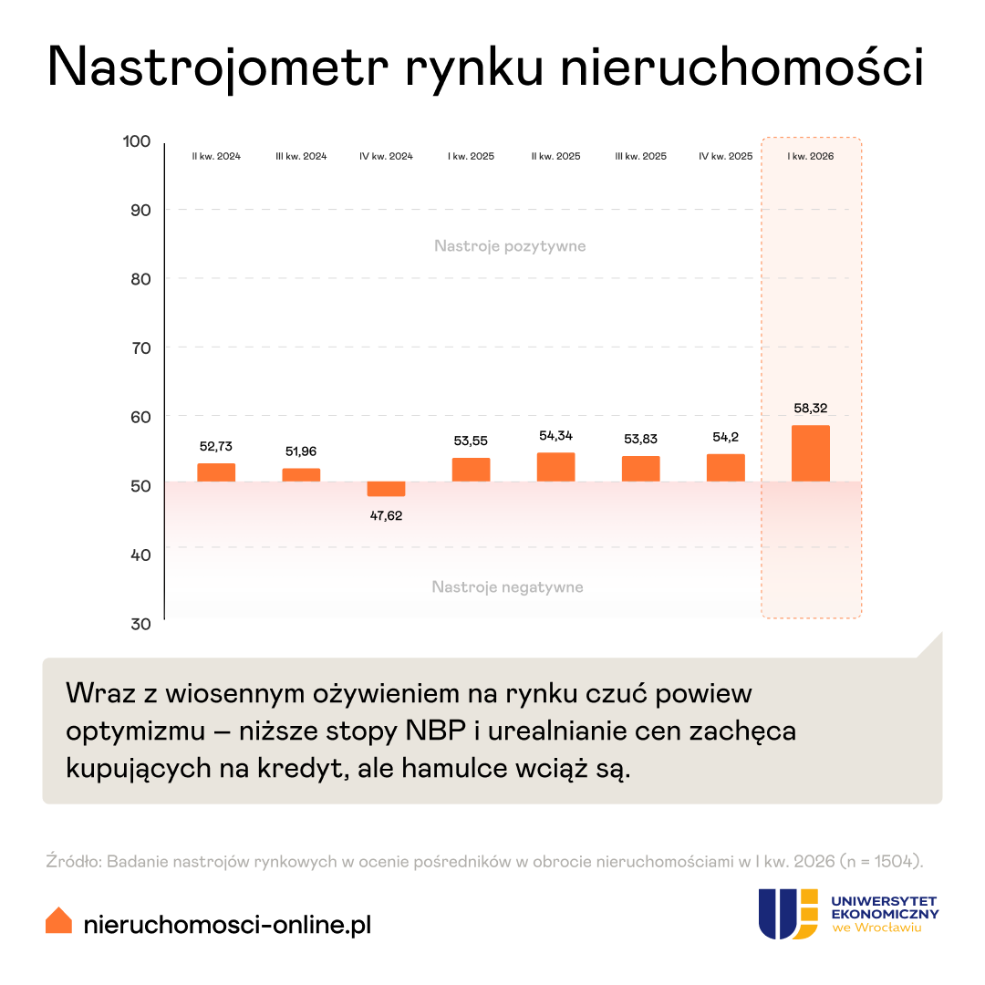 Nastrojometr rynku nieruchomości, opracowywany co kwartał przez portal Nieruchomosci-online.pl wraz z Uniwersytetem Ekonomicznym we Wrocławiu, wzrósł do poziomu 58,32 pkt, co stanowi skok o ponad 4 punkty w porównaniu do końcówki ubiegłego roku. To nie tylko piąty kwartał z rzędu nad kreską optymizmu (50 pkt), ale przede wszystkim najwyższy odczyt od połowy 2023 roku.