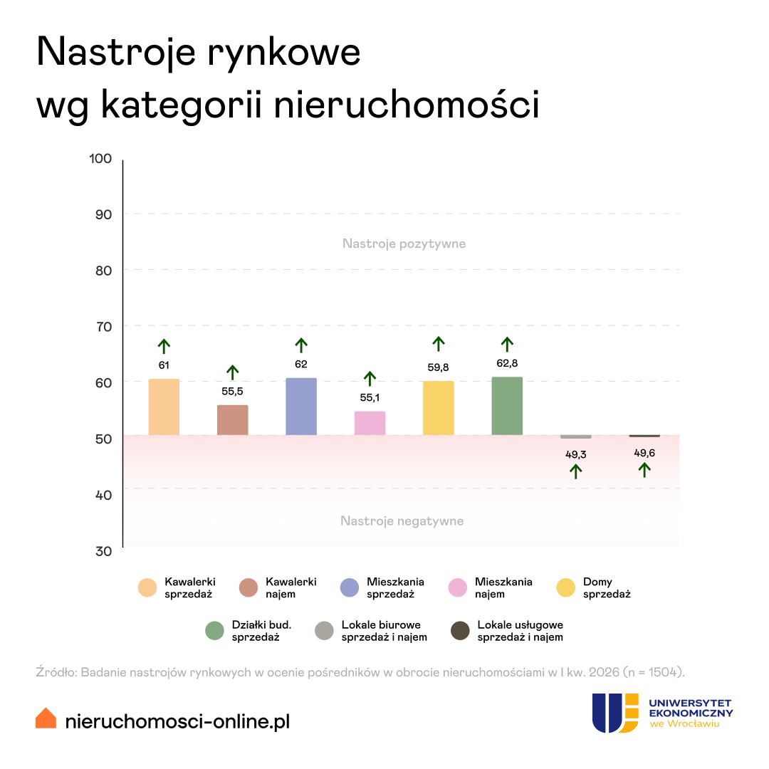Wszystkie osiem subindeksów odnotowało wzrost w porównaniu z IV kwartałem 2025 r. Cztery z nich znalazły się przy poziomie 60 pkt. Podczas gdy sprzedaż mieszkań, domów i działek kwitnie, najem notuje mniejszy optymizm (ok. 55 pkt dla kawalerek i mieszkań większych). Natomiast subindeksy dla lokali użytkowych zbliżyły się do poziomu optymizmu, przekraczając 49 pkt.