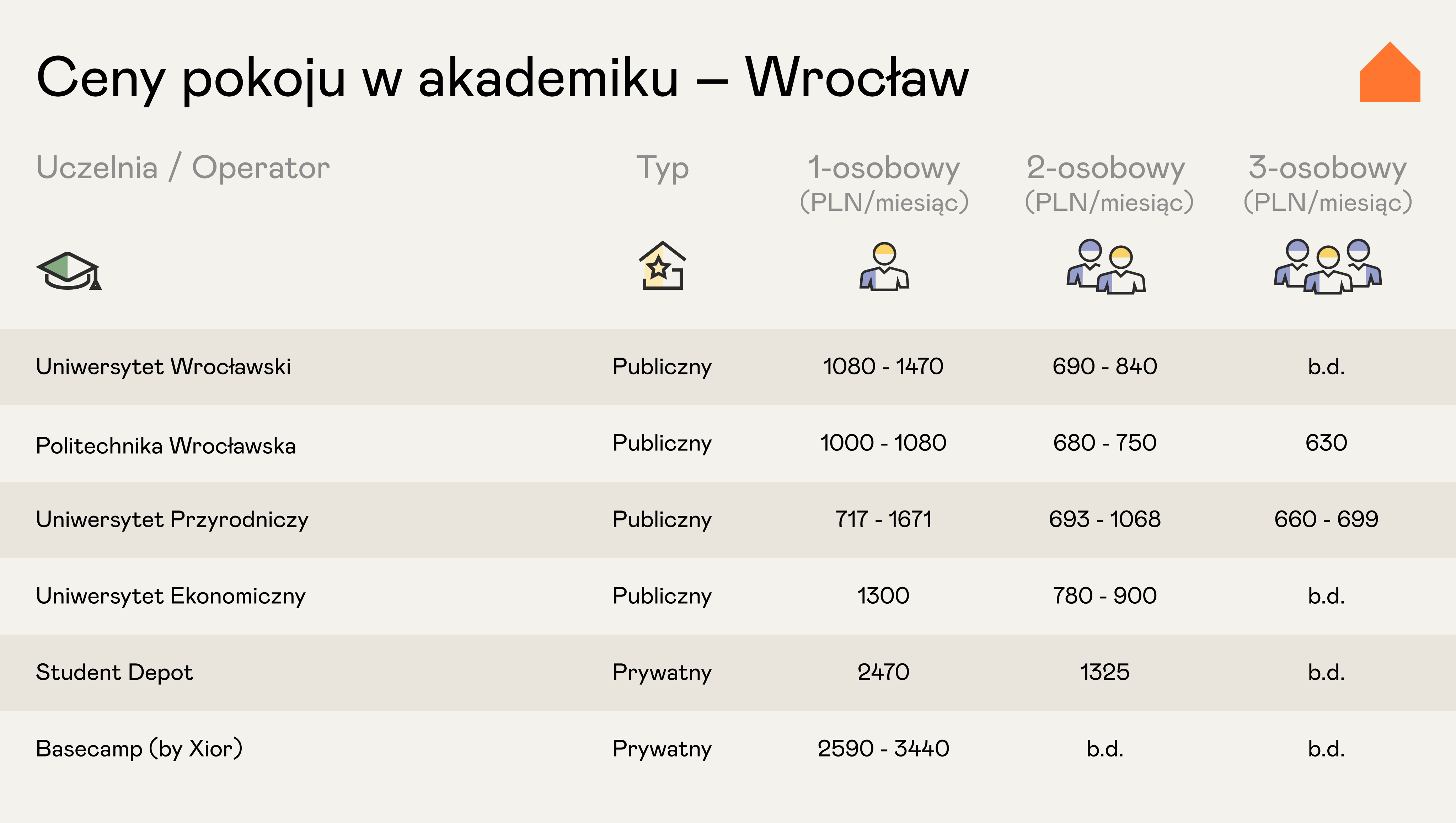 Sprawdziliśmy, ile kosztuje miejsce w pokojach jedno-, dwu- i trzyosobowych dla studentów we Wrocławiu w roku akademickim 2025/2026. Pod uwagę wzięliśmy zarówno akademiki uczelni publicznych, jak i te prywatne. Różnice cenowe są znaczne, jednak najtańsze opcje wciąż można znaleźć w domach studenckich przy uczelniach. W prywatnych akademikach studenci mogą liczyć na wyższy standard i dodatkowe udogodnienia, takie jak siłownia, strefa gier czy przestrzeń coworkingowa. Publiczne akademiki, mimo mniejszej liczby dodatków, są systematycznie modernizowane. Najem pokoju w prywatnym akademiku lub współdzielonym mieszkaniu to rozwiązanie dla tych, którzy stawiają na komfort. Grupowy wynajem mieszkania również może się opłacić – i zapewnia najwięcej swobody.