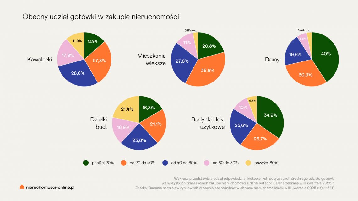 W 2025 roku struktura finansowania zakupów nieruchomości stopniowo się zmienia. W porównaniu z 2024 rokiem udział zakupów gotówkowych spada we wszystkich segmentach poza działkami.