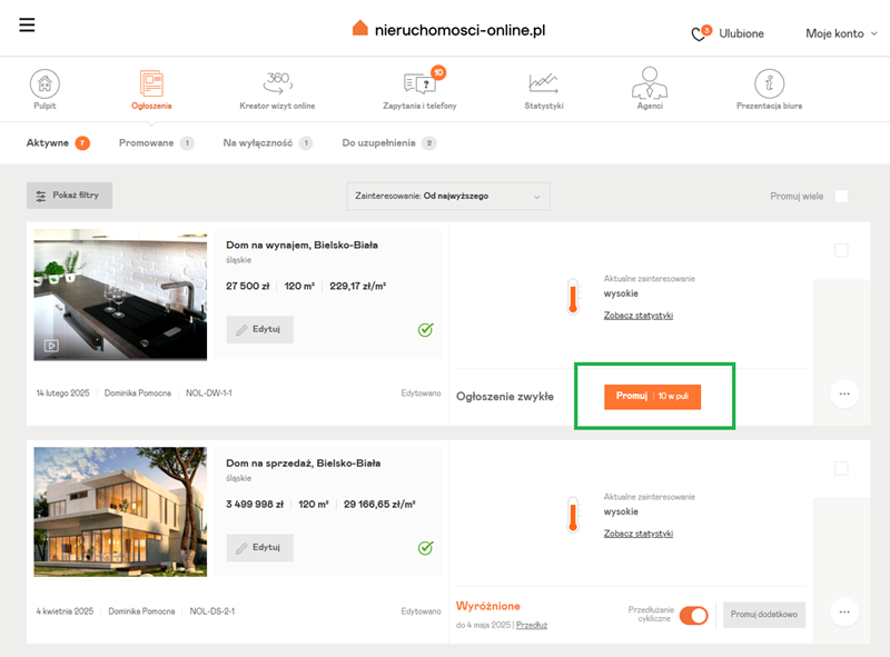 W zakładce „Ogłoszenia” na koncie biura w Nieruchomosci-online.pl kliknij przycisk Promuj przy ogłoszeniu, które chcesz wypromować.