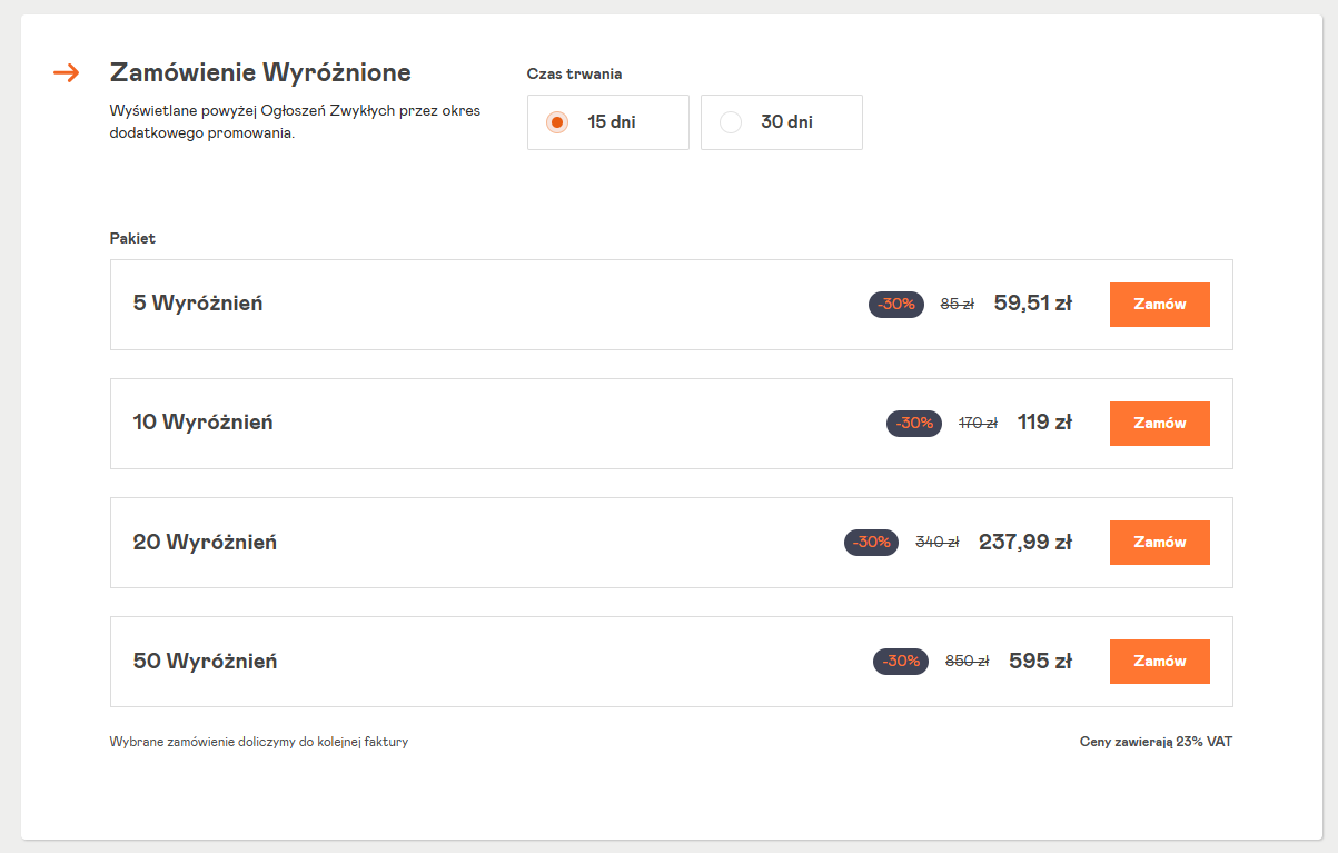 Możesz zakupić wyróżnienia o różnym czasie działania: 7, 15 i 30 dni.